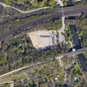 Am Eisenbütteler Wehr vorbei unter die Brücke dann rechts auf den Parkplatz, Durchfahrtshöhe 2m, Auto abstellen und dann Zufuß links an der Schranke vorbei und rechts rein, oder am Bahndamm rechts den Hügel hoch.