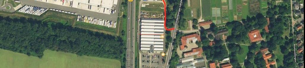 Über die Einfahrt vom Gartencenter, rechts am Gebäude vorbei dem asphaltierten Weg folgen.