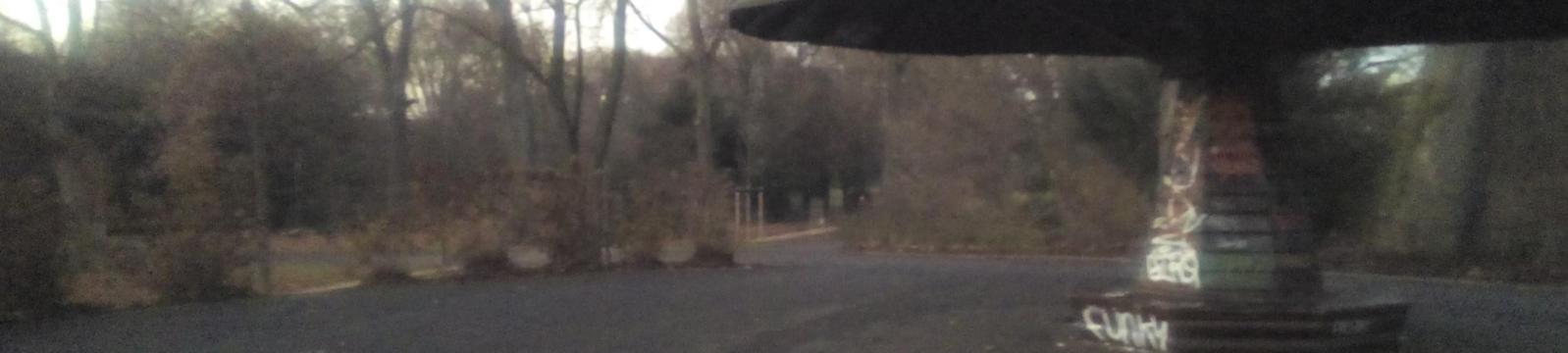 Park mit dunklen Ecken, der Weg vom Pilz (Unterstand) Richtung Stadt (siehe großes Bild) bzw. Planskizze, neue Bänke am grünen Pfeil.