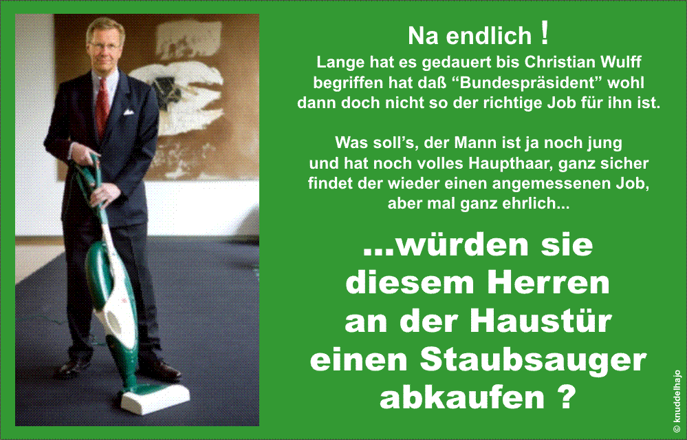 Inaktives Mitglied Geschrieben Februar 9, 2012 Wulff ist der Wunsch-Schwiegersohn der Muttis, die bei Livesendungen wie "Carmen Nebel" und "Volkstümliche Hitparade" in der ersten Reihe sitzen. Er hat das Aussehen eines biederen Bankberaters, keinerlei oder nur ein eingelerntes Mienenspiel, ein quäkend-näselndes Stimmorgan (unglaublich für jemanden, der Deutschland auch in seinen Reden repräsentieren soll), und er redet nur Abgedroschenes, Phrasen, das, was sowieso jeder schon weiß. Merkel hat ihn ausgesucht, weil sie von ihm keinen Widerstand zu erwarten hat. Jetzt wird er natürlich langsam oberpeinlich. Man darf gespannt sein, wie Merkel sich da aus der Affäre zieht. @Nuwas: Ich bin kein Blockwart. Blockwarte gab es früher, in einer Zeit, die von deinen Verlagen hochgehalten wird. Das Wort hättest du nun gerade nicht benutzen sollen.